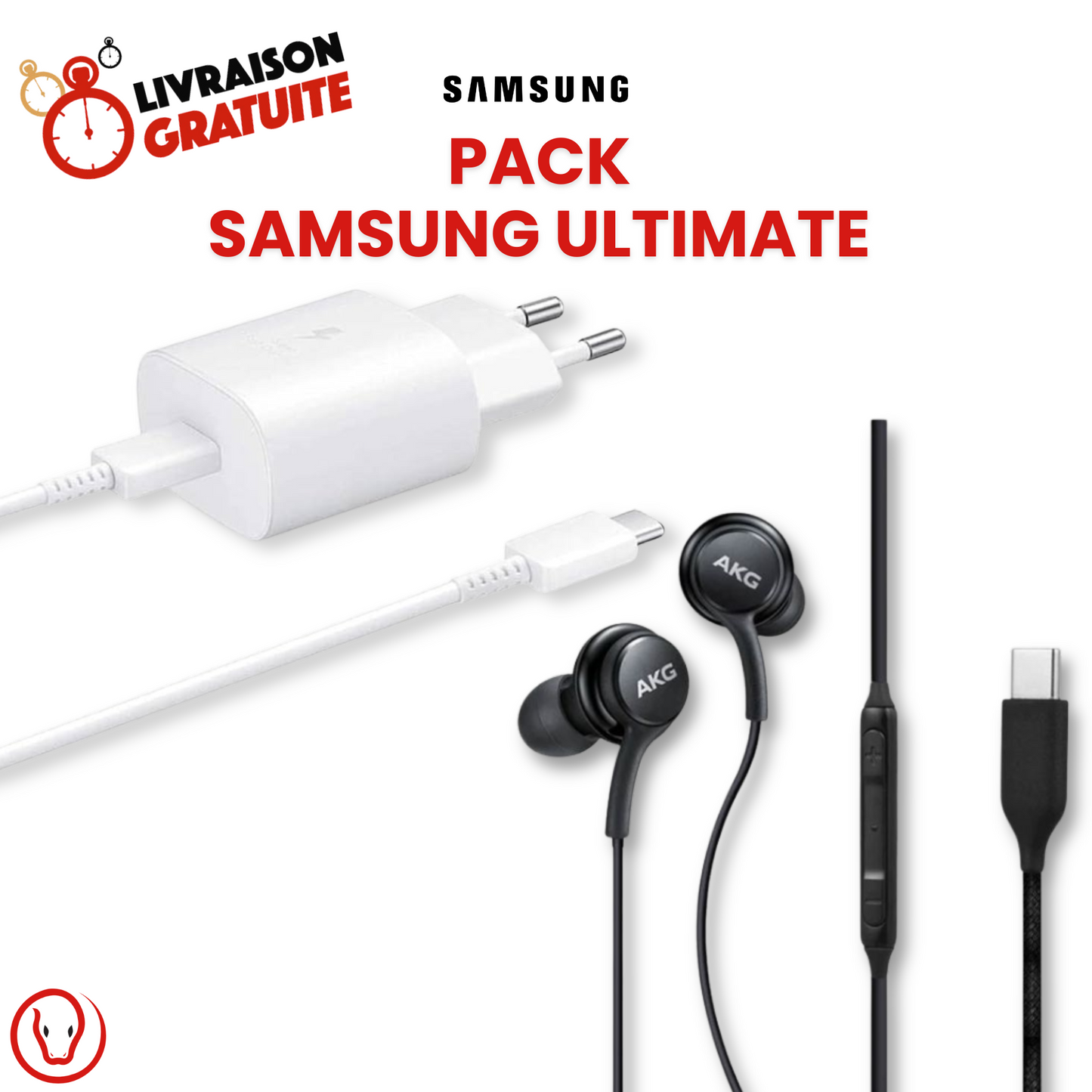 Ce Pack Samsung Ultimate 3-en-1 te propose puissance, qualité audio, durabilité et protection. Tout est là : un chargeur ultra rapide 45W, des écouteurs AKG USB-C et un câble USB-C.